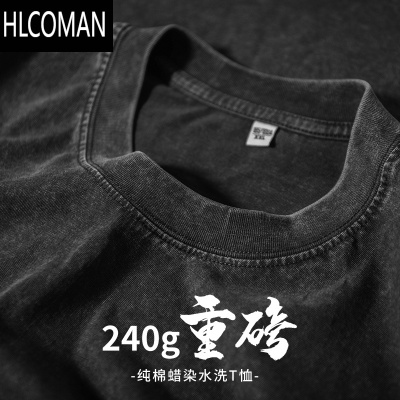 HLCOMAN240g水洗做旧t恤男女款夏天美式复古宽松大码短袖t潮体恤